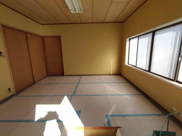 写真は、フロアーが完了して壁のクロスを貼る前の段階です。